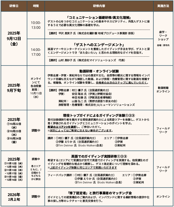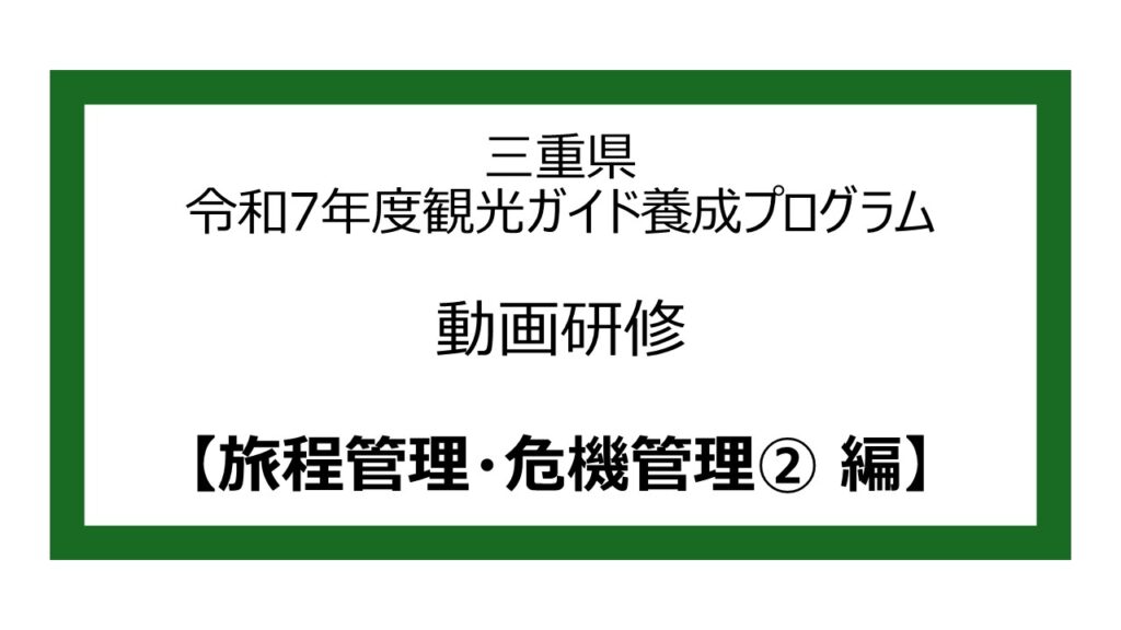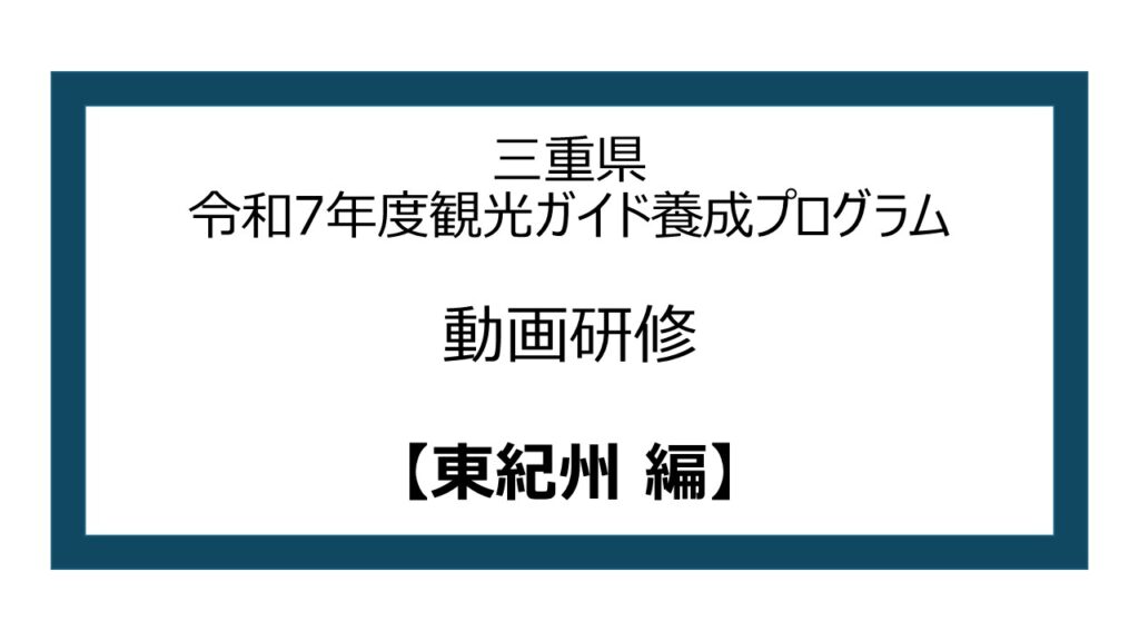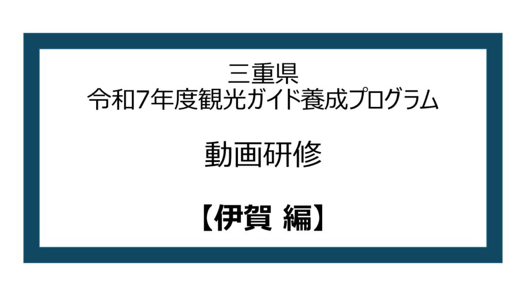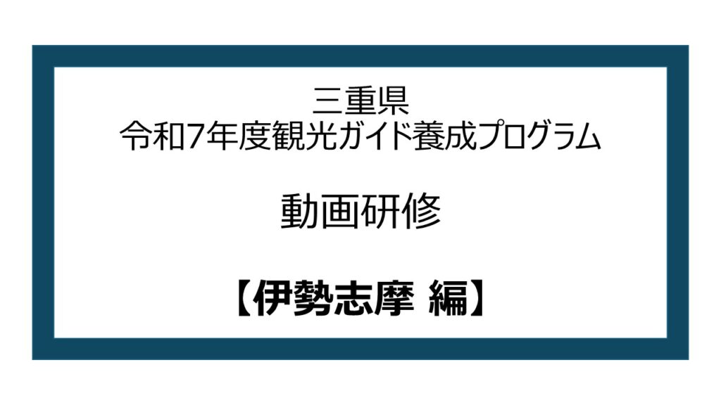 ※本年度の受講申込は終了しております 令和7年度 三重県観光ガイド養成プログラム 令和7年度 三重県観光ガイド養成プログラム 概要 本講座は、知識のインプットに偏らない、コミュニケーション力の向上やガイディング手法によるアウトプットを重視した、実践的な養成プログラムです。三重県の地域の歴史・文化や自然、暮らしや伝統をふまえたご案内ができるよう、トップガイドによるガイディング体験やガイド実践を含むフィールドワーク研修により、訪日外国人観光客に満足いただけるガイディングを実施する力を身に着けます。ガイディング体験やガイド実践の対象地は、魅力的な観光コンテンツが多く存在する伊勢志摩地域、東紀州地域、伊賀地域です。 カリキュラムおよび実施日時 動画研修・オンライン試験について 全5本の動画学習を実施いたします。お好きな時にお好きな場所で、何度でも繰り返し視聴できます。動画視聴後、希望エリアに関わらず、すべての試験(4つ:伊勢志摩 / 伊賀 / 東紀州 / 旅程管理・危機管理)を受験いただきます。すべての動画を視聴いただき、すべての試験での合格が必要です。11問以上正解で合格とし、合格した方のみ「現役トップガイドによるガイディング体験」にご参加いただけます。視聴・受験期間:2025年10月15日(水)まで 【受講の流れ】 ①研修動画を視聴 本ページの研修動画一覧から、各研修の研修ページへアクセスできます。②オンライン試験を受験 各動画の視聴後、研修動画ページの試験リンクからオンライン試験に進んでください。 11問 以上正解で合格です。 ※合格者には合格通知のメールが送信されます。 受験期限は2025年10月15日(水)まで ★ 各試験は10回まで受験できます ★ 試験終了後にすぐ試験の正答数が表示されます ★ 10月14日(火)8:59までは正答数のみ表示されます。設問の正誤表記は14日(火)9:00以降に開示します。 ★ 推奨ブラウザー環境:Google Chrome (動画の音声が小さい場合にはPCの設定でご調整ください)③合格後のステップへ 全ての試験に合格された方のみ、10月以降の研修にご参加いただけます。 【研修動画 一覧】 各研修のページは、下記の研修名をクリック(タップ)していただくことで、研修ページをご覧いただけます。※【旅程管理・危機管理編】の試験は、「旅程管理・危機管理②」受講後のみ実施されます。 「旅程管理・危機管理①」では試験はございません。
